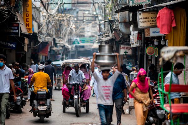 An electric rickshaw transports passengers along a street in the old quarters of New Delhi on Sept. 15, 2020.JEWEL SAMAD/AFP/Getty Images