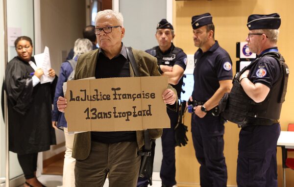 A man holds a placard reading 'French justice, 13 years too late' at the Paris courthouse, on Oct. 10.THOMAS SAMSON/AFP/Getty Images