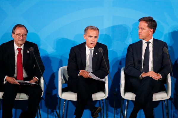 Bank of England Governor Mark Carney, center, is joined by Willis Towers Watson Chief Executive Officer John Haley, left, and Dutch Prime Minister Mark Rutte as he addresses the Climate Action Summit in the United Nations General Assembly, at U.N. headquarters, on Sept. 23, 2019.Jason DeCrow/The Associated Press