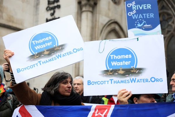 Demonstrators hold placards as they protest against Thames Water, in London, on Dec. 17.Mina Kim/Reuters
