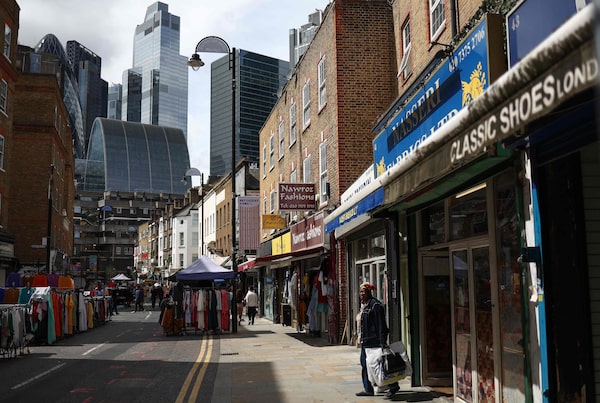 A shopper leaves a shop in Petticoat Lane Market, against the backdrop of The City of London financial district, on Aug. 11, 2023.HENRY NICHOLLS/AFP/Getty Images