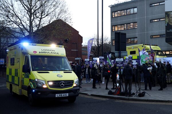 An ambulance on emergency call drives past an ambulance workers' strike, outside the NHS London Ambulance Service, in London, on Dec. 21, 2022.HENRY NICHOLLS/Reuters