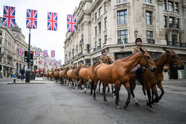 Union flags hang above as cavalry horses are walked along Regent Street, in London, on May 30.LEON NEAL/Getty Images