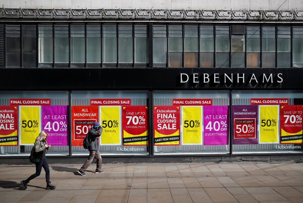 People walk past a Debenhams store in Manchester on April 9, 2021.MOLLY DARLINGTON/Reuters