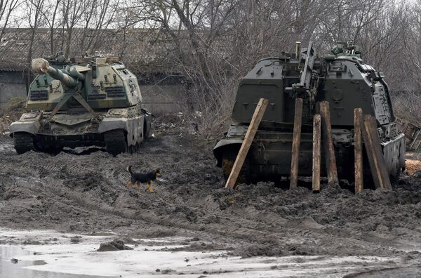 A dog runs past Russian armored vehicles parked at a railway station in the southern Russian Rostov region, on Feb. 25.STRINGER/AFP/Getty Images