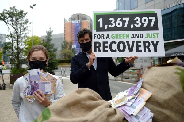 Representatives of Avaaz, Greenpeace and Transport & Environment, on behalf of the Green10, hold a protest during the first face-to-face EU summit since the coronavirus disease (COVID-19) outbreak, in Brussels, Belgium July 17, 2020.Johanna Geron/Reuters
