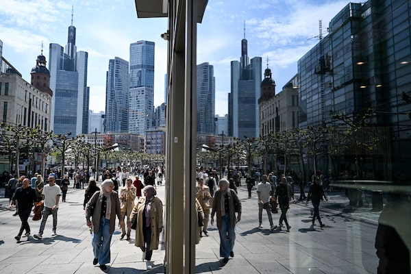 People walk on the main shopping Zeil street in front of the banking district skyline in Frankfurt, Germany, on April 23.KIRILL KUDRYAVTSEV/AFP/Getty Images