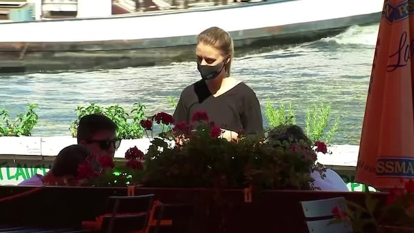 A server wears a mask while listening to patrons at a restaurant in Germany.Reuters