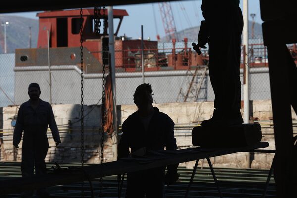 An employee works on the hull of a new ship being built in a Perama shipyard on July 8, 2015, in Athens.Christopher Furlong/Getty Images Europe
