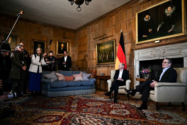 British Prime Minister Keir Starmer, right, and German Chancellor Olaf Scholz attend a bilateral meeting in Britain, on Feb. 2.BEN STANSALL/Reuters