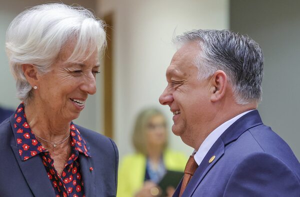 ECB President Christine Lagarde, left, speaks with Hungary's Prime Minister Viktor Orban during a round table meeting at an EU summit in Brussels, on June 24.Olivier Matthys/The Associated Press