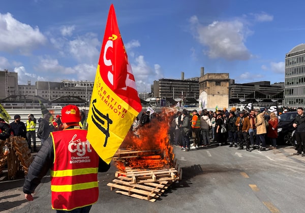 Workers and union members gather outside Gare de Lyon train station as part of strikes and protests against the French government's pension reform, in Paris, on April 13.BART BIESEMANS/Reuters
