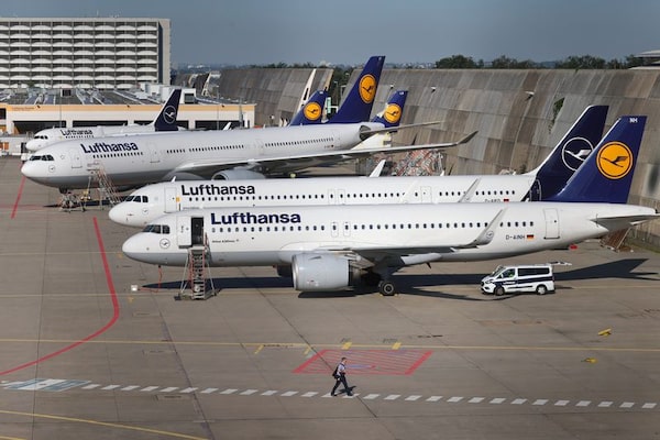 Lufthansa planes are seen parked on the tarmac of Frankfurt Airport, Germany on June 25, 2020.Kai Pfaffenbach/Reuters