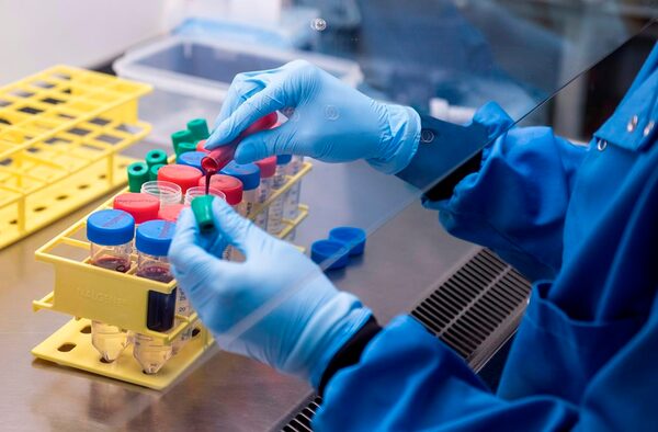 Blood samples from coronavirus vaccine trials are handled inside the Jenner Institute in Oxford, England, on June 25, 2020.The Canadian Press