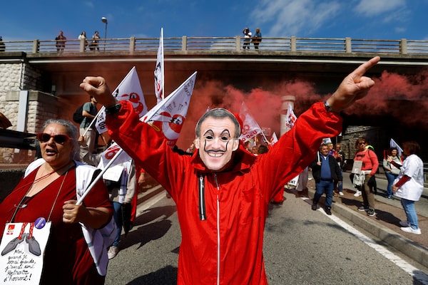 A protester wearing a mask depicting French President Emmanuel Macron takes part in a demonstration in Nice, France, on March 23.ERIC GAILLARD/Reuters