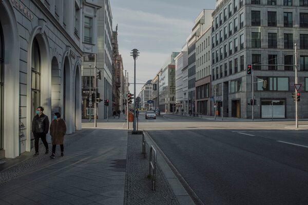 People stroll the nearly empty streets of Berlin, on April 14, 2020.Emile Ducke/The New York Times News Service