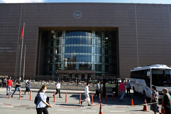 People walk outside a court in Istanbul on July 3, 2020, where the trial began for defendants accused of smuggling former Nissan Motor Co. chairman Carlos Ghosn out of Japan to Lebanon, via Turkey.Mehmet Guzel/The Associated Press