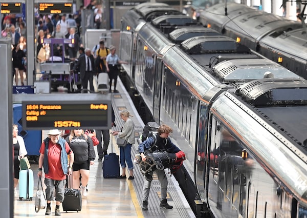 Passengers board a train at Paddington Station, in London, on June 20.TOBY MELVILLE/Reuters