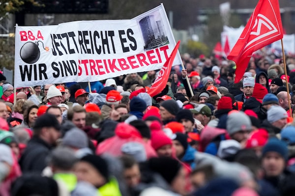 Volkswagen employees attend an IG Metall union rally in front of car maker's headquarters in Wolfsburg, Germany, on Dec. 9.Martin Meissner/Reuters