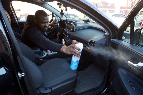 Uber and Lyft driver Adama Fofana sprays disinfectant in his car in New York City on March 9, 2020.Joe Penney/Reuters