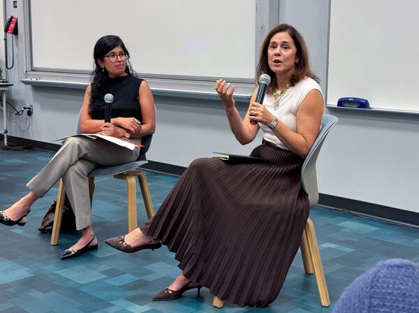 Dallas Federal Reserve Bank President Lorie Logan speaks with students at the University of Texas on Oct. 2. She says risks to the U.S. labour market lie largely to the downside.Ann Saphir/Reuters