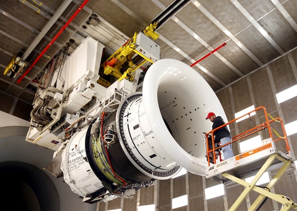 A General Electric employee prepares a GEnx-747 jet engine for a test at a facility in Peebles, Ohio, on Nov. 15, 2013.Matt Sullivan/Reuters