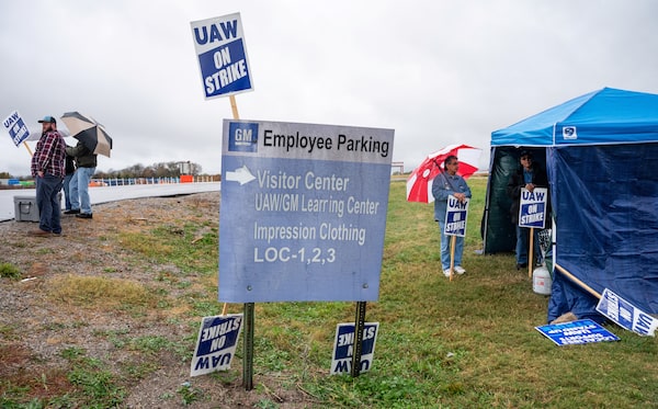 Union members picket outside a GM engine plant in Spring Hill, Tenn., on Oct. 30.SETH HERALD/Reuters