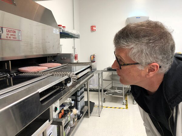 Impossible Foods chief executive Pat Brown watches a flame broiler cooking his company's plant-based patties at a facility in Redwood City, Calif., on March 26, 2019.Jane Lanhee Lee/Reuters