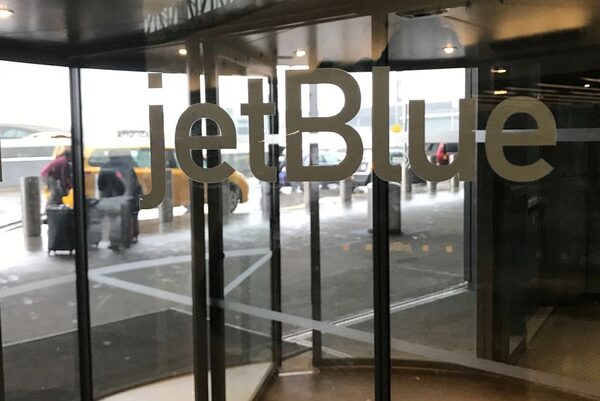 The JetBlue Airways logo is seen on a revolving door entering John F. Kennedy Airport in the Queens borough of New York U.S., Jan. 24, 2017.Shannon Stapleton/Reuters