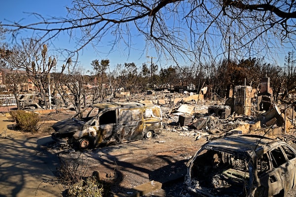 Burned cars sit outside destroyed homes amid the rubble of the fire-ravaged Pacific Palisades Bowl Mobile Estates, in Los Angeles, Calif., on Jan. 13.AGUSTIN PAULLIER/AFP/Getty Images