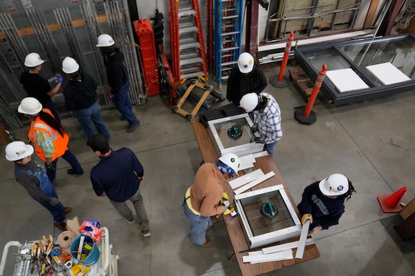 The sound of whirring drills filled the Ironworkers Local 63 training centre just outside Chicago during one exploratory training program that is reliant on state and federal funds. About two-dozen women donned hard hats, work gloves and safety glasses to practice assembling windows as an instructor looked on. Two groups raced each other to see how quickly they could perfect each assembly. Another practices caulking nearby.