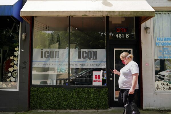 A woman carrying a Postmates delivery bag passes by a hair salon in Atlanta on April 22, 2020.ELIJAH NOUVELAGE/Reuters