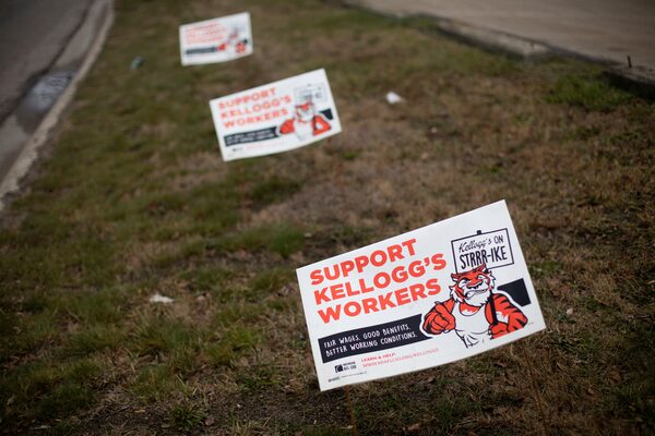 Lawn signs in support of the striking Kellogg's workers, at the Porter Street plant, in Battle Creek, Mich., on Dec. 11.EMILY ELCONIN/Reuters
