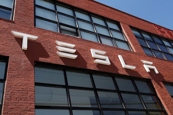 The Tesla logo is seen outside a dealership in New York City on April 26, 2021.SHANNON STAPLETON/Reuters