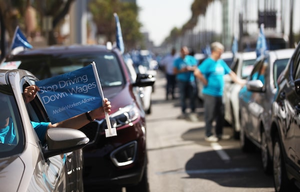 Uber and Lyft drivers line up in their vehicles before driving in a pro-union march through a section of Los Angeles International Airport on Oct. 2, 2019.Mario Tama/Getty Images