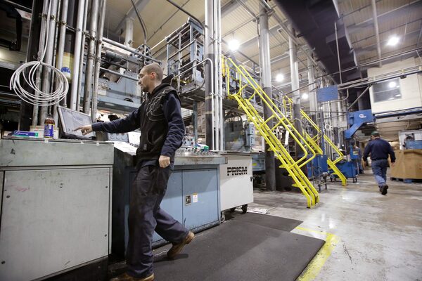 In this Thursday, April 11, 2019 photo pressman Lukus Ladeinde, of Pittsfield, Mass., left, works on the printing presses at The Berkshire Eagle newspaper, in Pittsfield.Steven Senne/The Associated Press