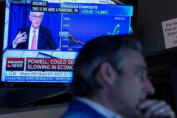A trader works, as Federal Reserve Chair Jerome Powell is seen delivering remarks on a screen, on the floor of the New York Stock Exchange in New York City on May 4.BRENDAN MCDERMID/Reuters