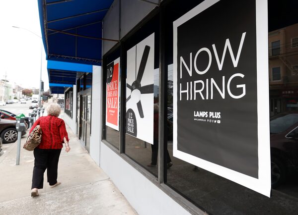 A pedestrian walks by a now hiring sign at a Lamps Plus store, in San Francisco, Calif., on Sept. 16.Justin Sullivan/Getty Images