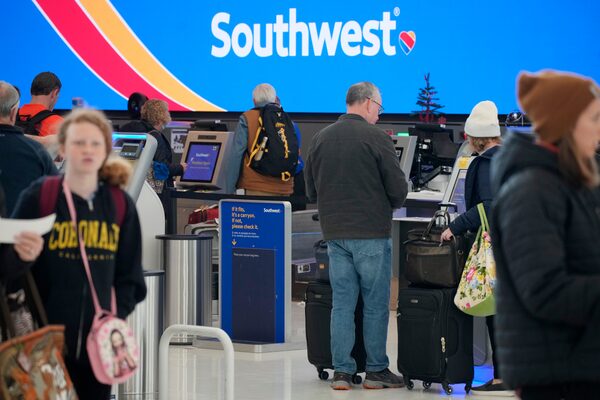 Travellers queue at the check-in kiosks for Southwest Airlines at Denver International Airport, on Dec. 30, 2022.David Zalubowski/The Associated Press