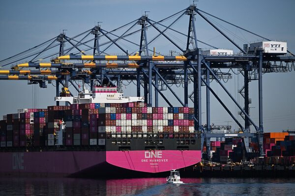 Cranes unload cargo shipping containers from the ONE Hannover container ship at the Port of Los Angeles, in San Pedro, Calif., on April 10PATRICK T. FALLON/AFP/Getty Images