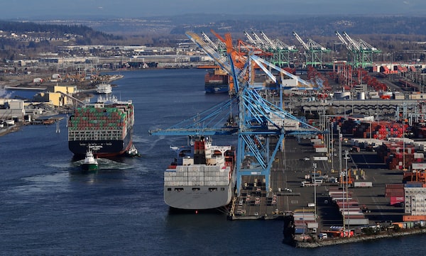 The Cape Kortia container ship, left, heads into the Port of Tacoma, in Commencement Bay, on March 5, 2019.Ted S. Warren/The Associated Press