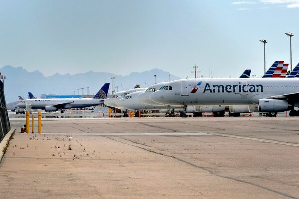 In this March 25, 2020, file photo, American and United Airlines jets are temporarily stored west of the terminals at Sky Harbor International Airport in Phoenix.Matt York/The Associated Press