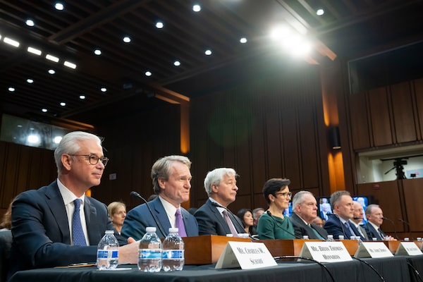 The CEOs of major U.S. banks testify during a Senate committee hearing in Washington, on Dec. 6.Alex Brandon/The Associated Press