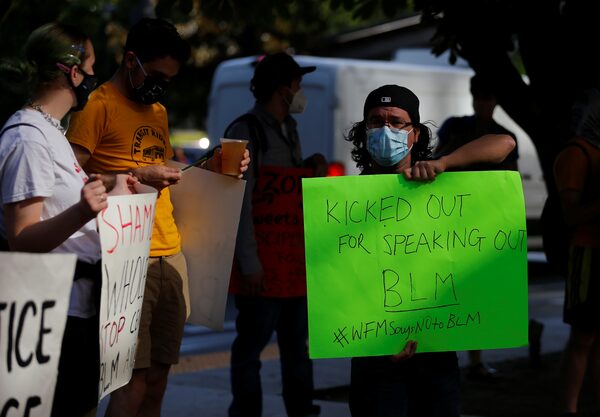 Trent Wu protests with other employees of the South Lake Union Whole Foods against store management not allowing workers to wear Black Lives Matter apparel in Seattle on June 25, 2020.LINDSEY WASSON/Reuters