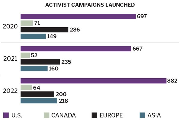 Canadian utility Algonquin Power is also dealing with multiple activists, with Starboard and Corvex joining Ancora in its call for quick asset sales to help pay down debt. Algonquin’s shares are down roughly 40% over the past year. A little more than one-third of all campaigns launched in the first quarter of 2023 were swarming scenarios, Lazard reports, and that figure is expected to grow.