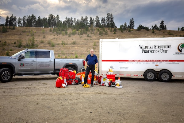 Randy Cowling, President of WASP Wildfire, surrounded by wildfire protection equipment.Emily Heather/The Globe and Mail