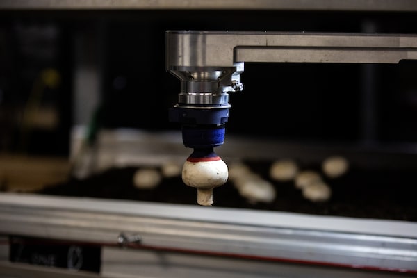 A suction cup attaches to a mushroom as 4AG Robotics demonstrates its mushroom-picking robot in Salmon Arm, B.C.Marissa Tiel/The Globe and Mail
