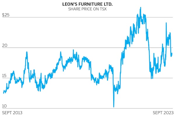 Walsh joined Leon’s in 2015 after a long career at Canadian Tire and succeeded Edward Leon as CEO in 2021. The share price was $13 in April 2013, just after Leon’s acquired The Brick furniture and electronics chain. Lately, it’s been around $19. “We haven’t told our story,” Walsh says.