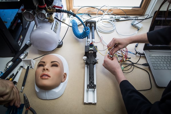 Holly Peck, a research scientist at Sanctuary AI, which is trying to create artificial general intelligence in robots, adjusts the head on a robotic doll, in Vancouver, on April 25, 2018.DARRYL DYCK