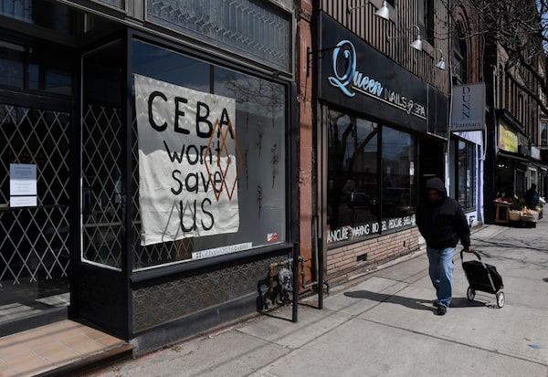 A hand painted sign about the Canada Emergency Business Account in the front window of Frances Watson, a store in Toronto, on April 15, 2020.Fred Lum/The Globe and Mail
